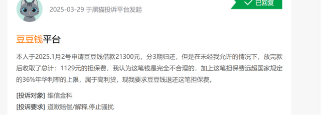 3月29日,有效户称2025年1月2号在豆豆钱苦求告贷21300元,分3期璧还,但临了却被发现收取了1129元的担保费,且累计借钱本钱超36%的上限。
