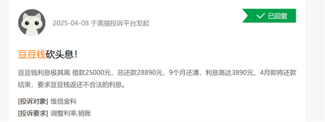 而在黑猫投诉上,有效户称借钱25000元,总还款28890元,9个月还清,利息高达3890元,据此诡计,年化利率亦为35.9%。