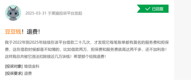 无独到偶,3月31日,有效户称2022年到2025年接续在豆豆钱借钱二十屡次,后发现每笔账单齐存在做事费和担保费,3年时间,其累计被扣近几万元。