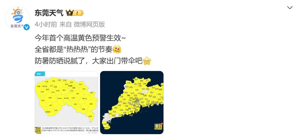 省称心台臆想,本年高考工夫(7-9日),广东莫得大界限降水进程,是高温伴散播雷雨的天气,局部雨势大。天气酷热,东莞市称心台于6月7日10时23分发布本年首个高温黄色预警信号。考生们请介意防暑降温,提前野心好赴考阶梯。