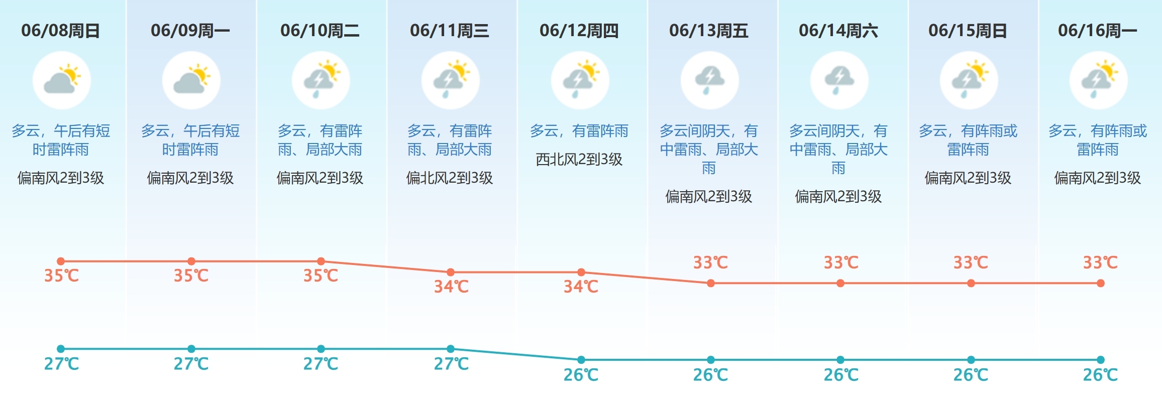 10到11日多云,有雷阵雨、局部大雨;