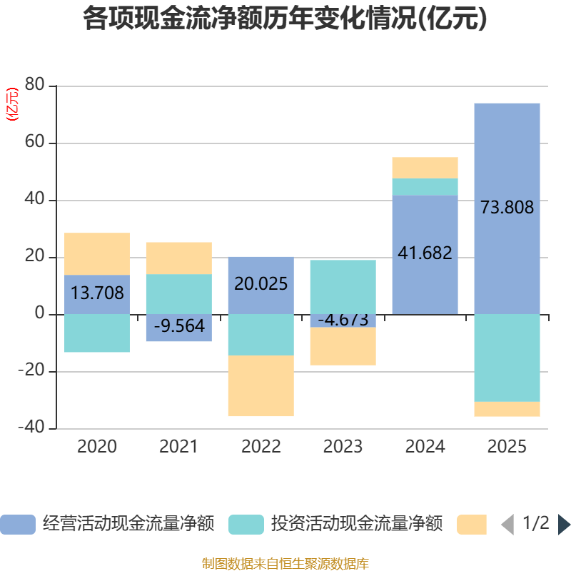 截止2025年,公司蓄意看成现款流净额为73.81亿元,同比增长77.07%;筹资看成现款流净额-5.18亿元,同比减少12.56亿元;投资看成现款流净额-30.72亿元,上年同时为5.87亿元。
